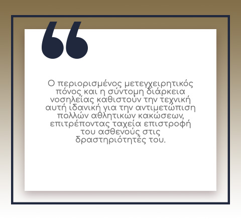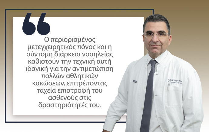 Η αρθροσκόπηση προσφέρει τη δυνατότητα ελάχιστα επεμβατικής αντιμετώπισης μιας μεγάλης ποικιλίας αθλητικών κακώσεων.