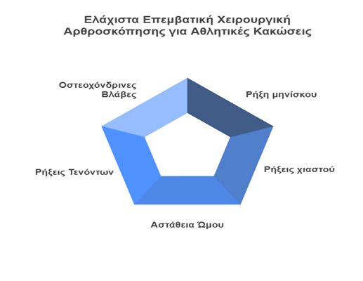 - Κακώσεις πρόσθιου και οπίσθιου χιαστού συνδέσμου: Συχνές σε αθλητές υψηλών απαιτήσεων. Η αρθροσκοπική αποκατάσταση της ρήξης χιαστού περιλαμβάνει ανακατασκευή του συνδέσμου με μόσχευμα.