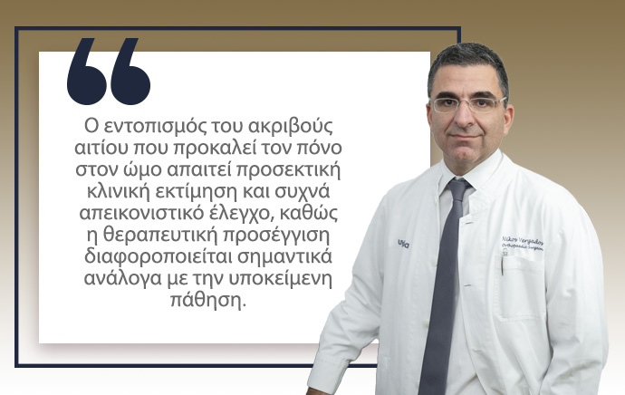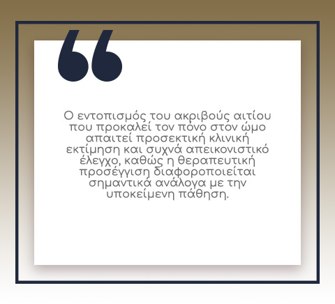 Ο εντοπισμός του ακριβούς αιτίου που προκαλεί τον πόνο στον ώμο απαιτεί προσεκτική κλινική εκτίμηση και συχνά απεικονιστικό έλεγχο. Σε κάθε περίπτωση η θεραπευτική προσέγγιση διαφοροποιείται σημαντικά ανάλογα με την υποκείμενη πάθηση.