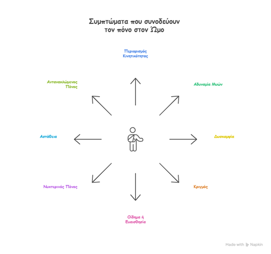 Ο πόνος στον ώμο συχνά συνοδεύεται από ένα σύνολο συμπτωμάτων. Τα συμπτώματα αυτά παρέχουν πολύτιμες πληροφορίες για την υποκείμενη αιτία πρόκλησης του πόνου και καθοδηγούν τη διαγνωστική διαδικασία.